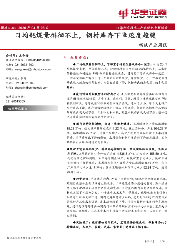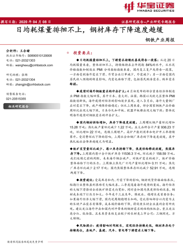 【华宝证券】【20200408】20200408-华宝证券-钢铁产业周报:日均耗煤量徘徊不上,钢材库存下降速度趋缓-14页
