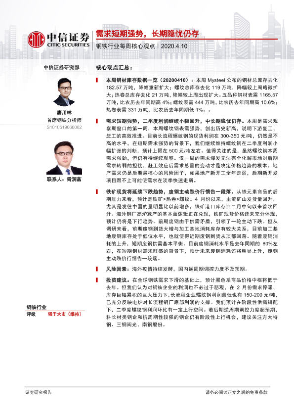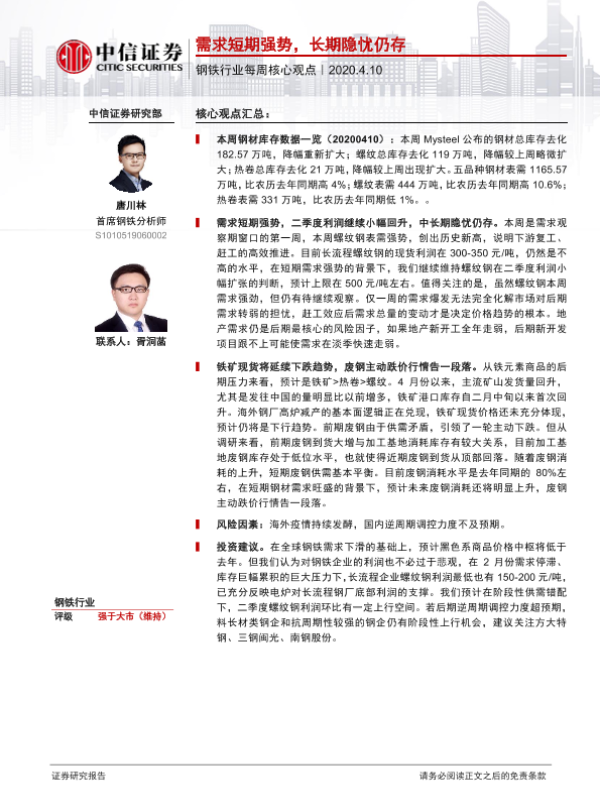 【中信证券】【20200410】20200410-中信证券-钢铁行业每周核心观点:需求短期强势,长期隐忧仍存-3页