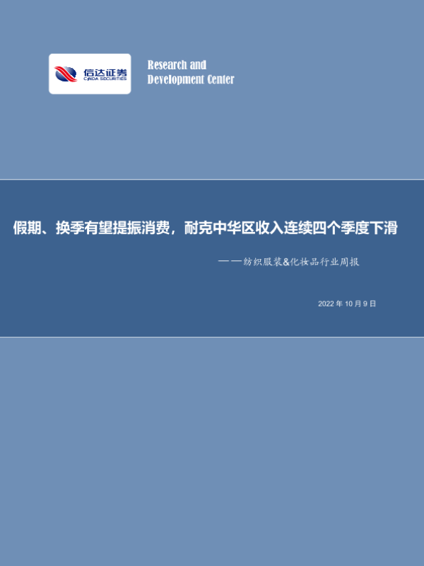 【信达证券】【20221009】20221009-信达证券-纺织服装&化妆品行业周报:假期、换季有望提振消费,耐克中华区收入连续四个季度下滑-21页