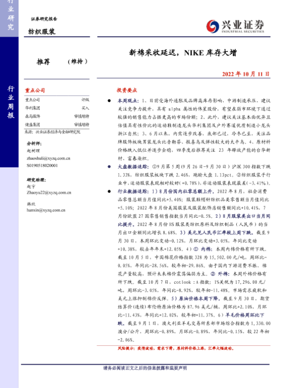 【兴业证券】【20221011】20221011-兴业证券-纺织服装行业周报:新棉采收延迟,NIKE库存大增-19页
