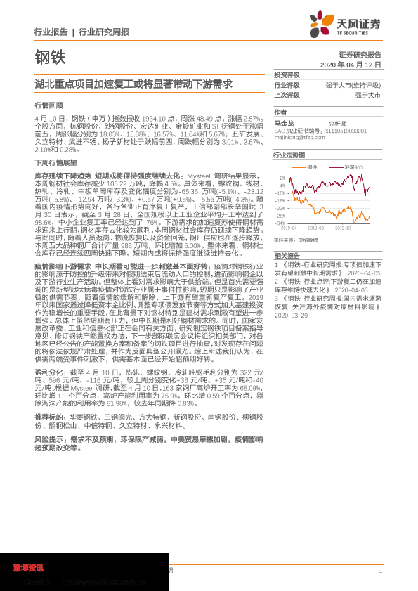 【天风证券】【20200412】钢铁行业研究周报:湖北重点项目加速复工或将显著带动下游需求-13页