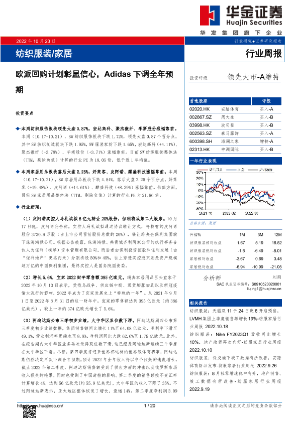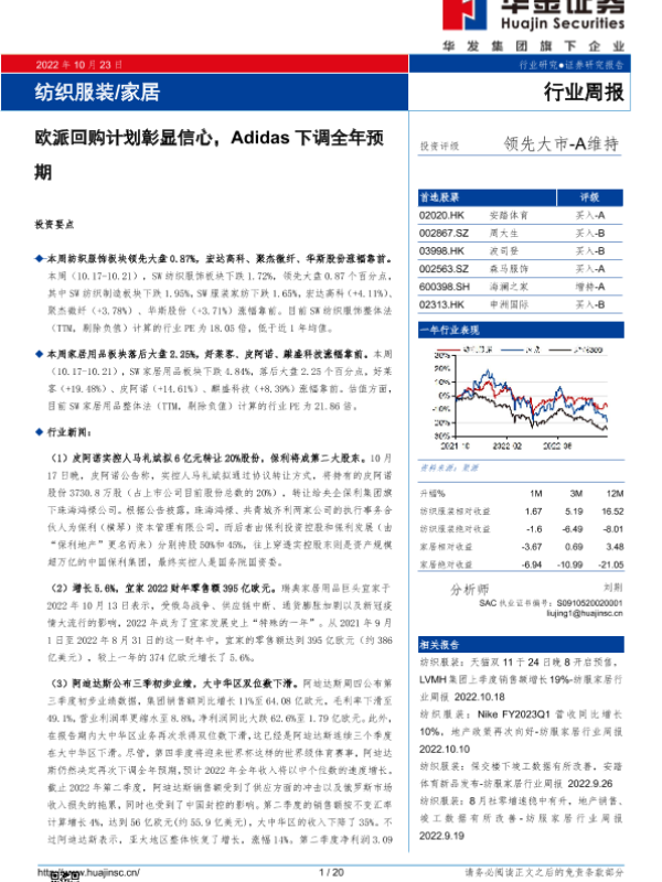 【华金证券】【20221023】纺织服装 家居行业周报:欧派回购计划彰显信心,Adidas下调全年预期-20页