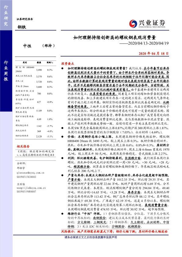【兴业证券】【20200418】20200418-兴业证券-钢铁行业周报:如何理解持续创新高的螺纹钢表观消费量-17页