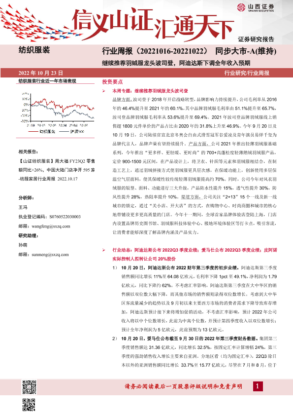 【山西证券】【20221023】纺织服装行业周报:继续推荐羽绒服龙头波司登,阿迪达斯下调全年收入预期-24页
