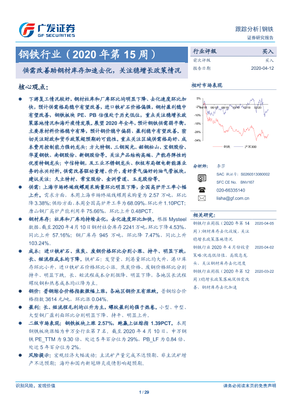 【广发证券】【20200412】钢铁行业(2020年第15周):供需改善助钢材库存加速去化,关注稳增长政策情况-29页