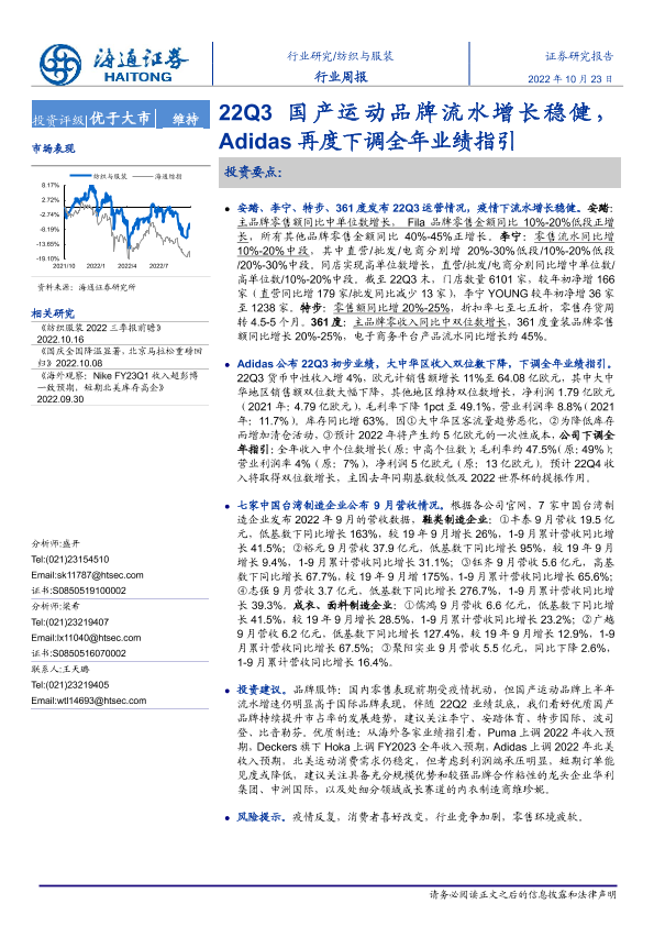 【海通证券】【20221023】20221023-海通证券-纺织与服装行业周报:22Q3国产运动品牌流水增长稳健,Adidas再度下调全年业绩指引-11页