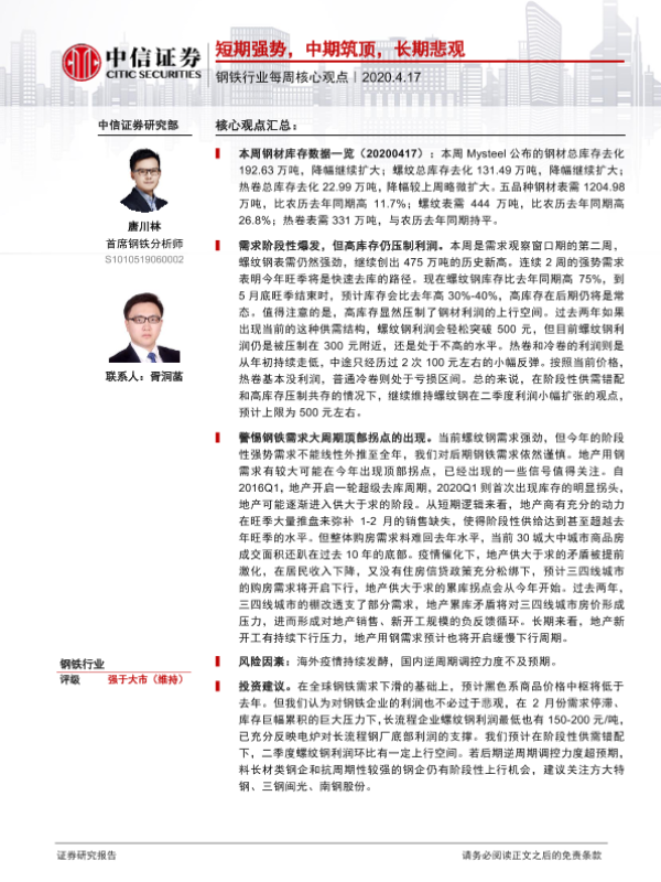 【中信证券】【20200417】20200417-中信证券-钢铁行业每周核心观点:短期强势,中期筑顶,长期悲观-3页