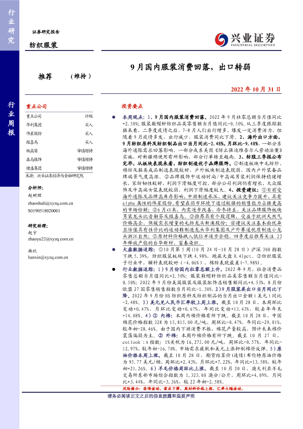 【兴业证券】【20221031】20221031-兴业证券-纺织服装行业周报:9月国内服装消费回落,出口转弱-21页