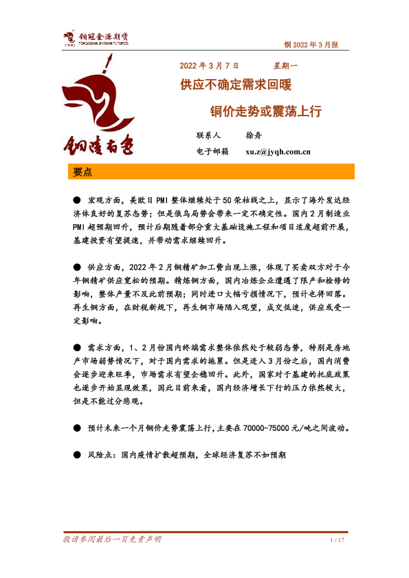【铜冠金源期货】【20220307】铜2022年3月报:供应不确定需求回暖,铜价走势或震荡上行-17页
