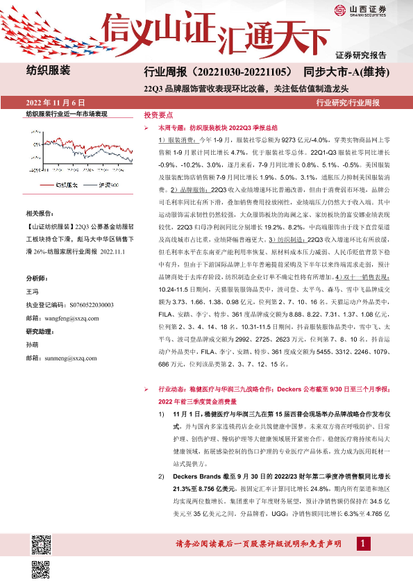 【山西证券】【20221106】纺织服装行业周报:22Q3品牌服饰营收表现环比改善,关注低估值制造龙头-28页