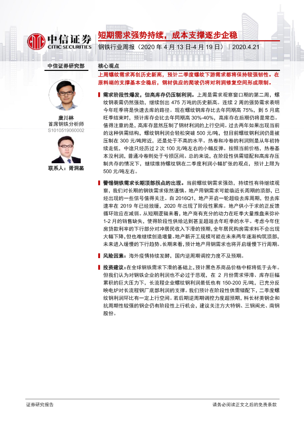 【中信证券】【20200421】20200421-中信证券-钢铁行业周报:短期需求强势持续,成本支撑逐步企稳-13页