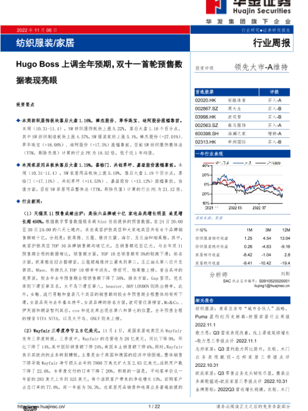 【华金证券】【20221106】20221106-华金证券-纺织服装行业周报:Hugo Boss上调全年预期,双十一首轮预售数据表现亮眼-22页