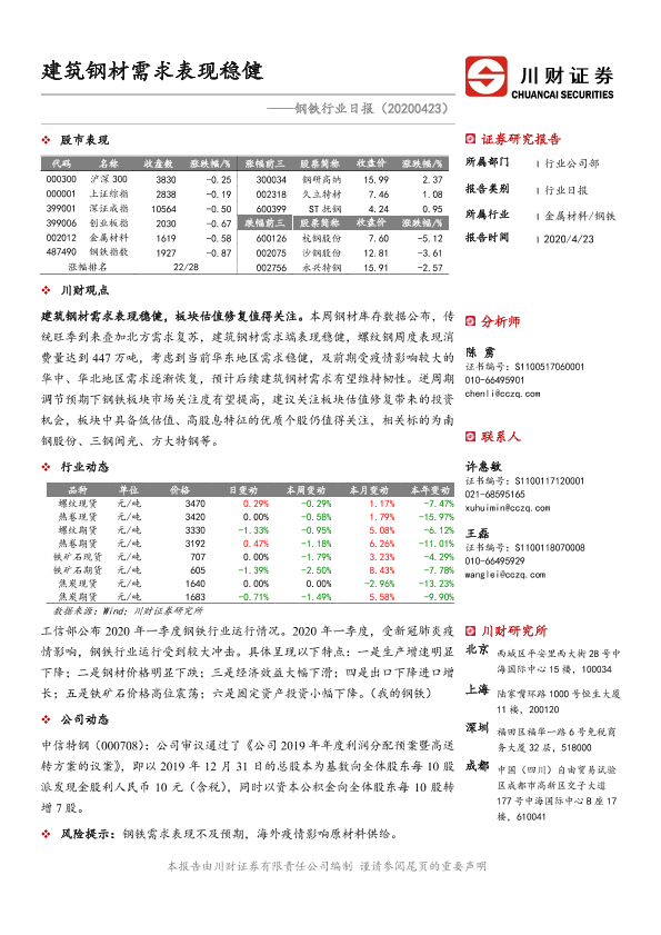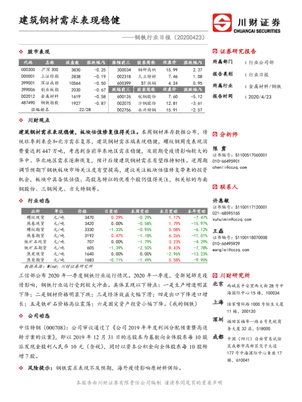 【川财证券】【20200423】钢铁行业日报:建筑钢材需求表现稳健-2页