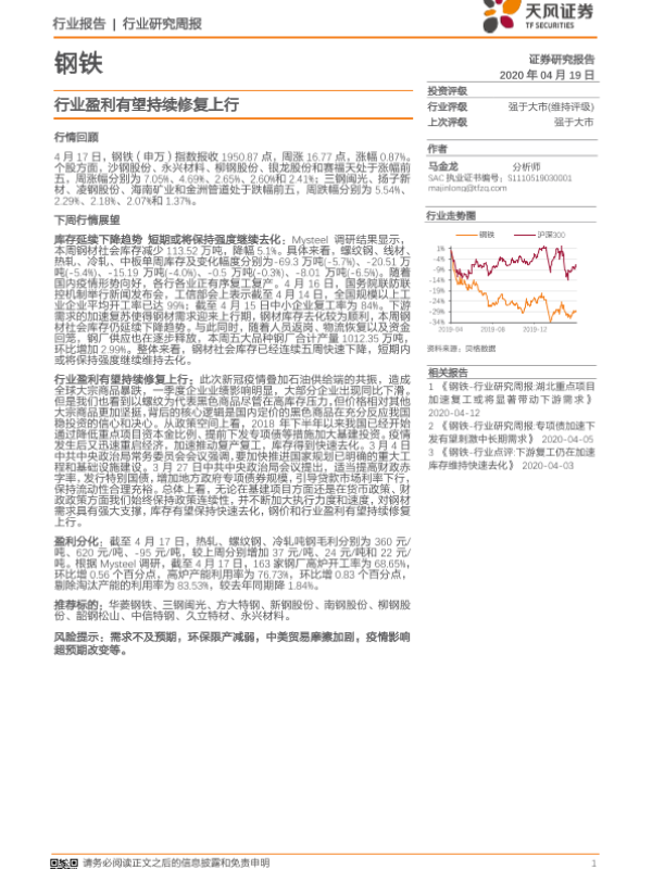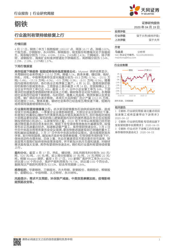 【天风证券】【20200419】20200419-天风证券-钢铁行业研究周报:行业盈利有望持续修复上行-13页
