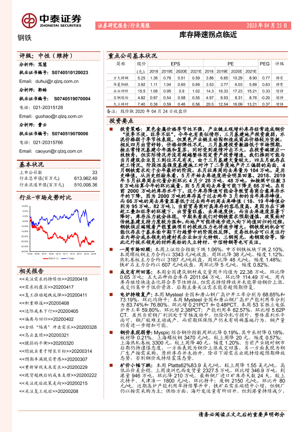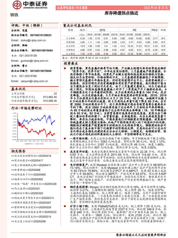 【中泰证券】【20200425】20200425-中泰证券-钢铁行业周报:库存降速拐点临近-14页