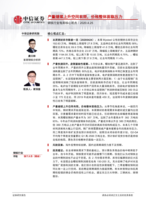 【中信证券】【20200425】20200425-中信证券-钢铁行业每周核心观点:产量继续上升空间有限,价格整体面临压力-3页
