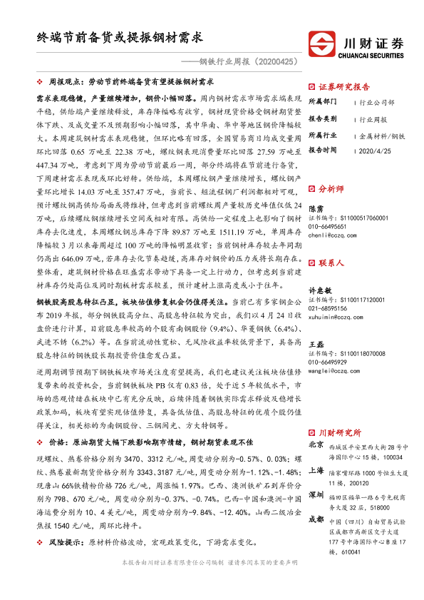 【川财证券】【20200425】钢铁行业周报:终端节前备货或提振钢材需求-23页