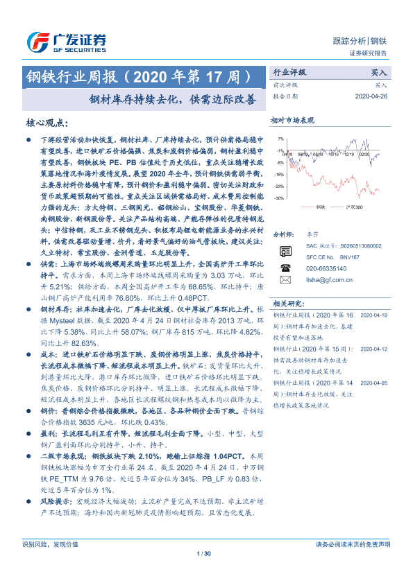 【广发证券】【20200426】20200426-广发证券-钢铁行业周报(2020年第17周):钢材库存持续去化,供需边际改善-30页