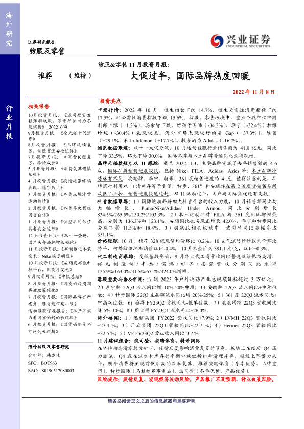 【兴业证券】【20221108】纺服&零售 11月投资月报:大促过半,国际品牌热度回暖-25页