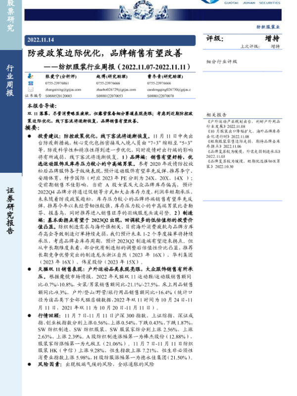 【国泰君安证券】【20221114】20221114-国泰君安-纺织服装行业周报:防疫政策边际优化,品牌销售有望改善-16页