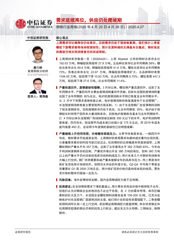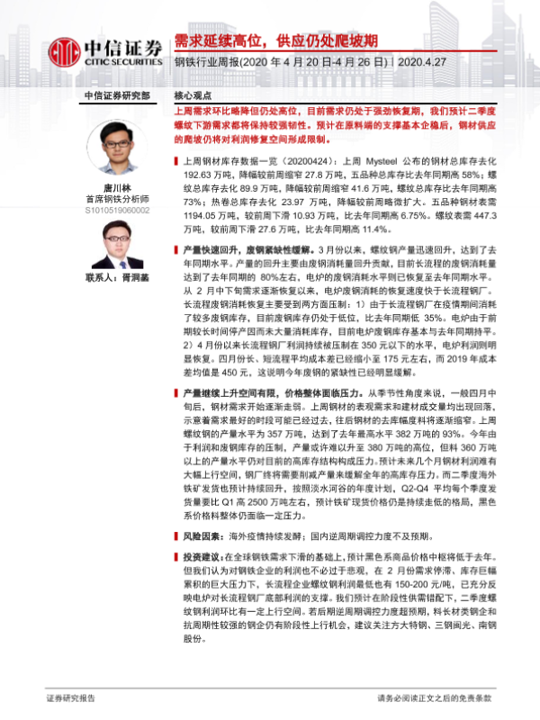 【中信证券】【20200427】20200427-中信证券-钢铁行业周报:需求延续高位,供应仍处爬坡期-14页