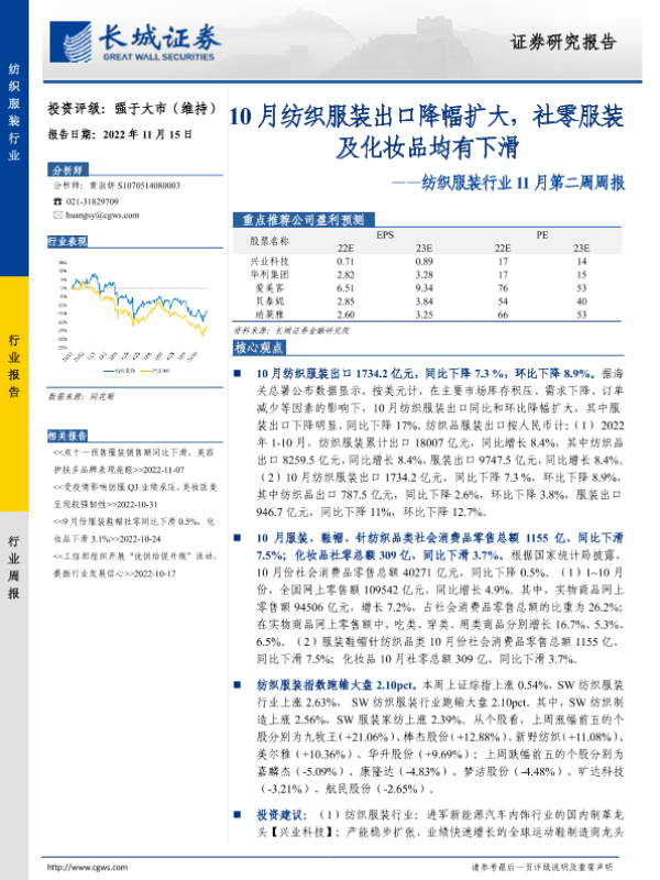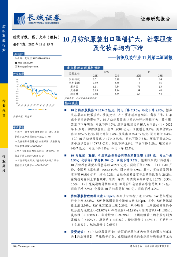 【长城证券】【20221115】20221115-长城证券-纺织服装行业11月第二周周报:10月纺织服装出口降幅扩大,社零服装及化妆品均有下滑-12页