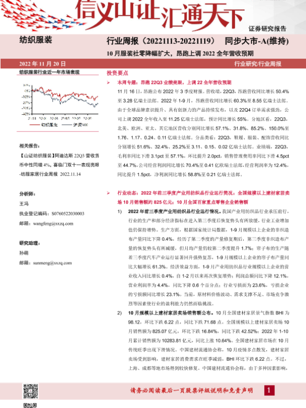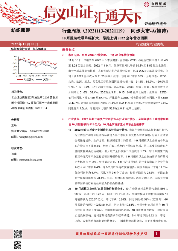 【山西证券】【20221120】纺织服装行业周报:10月服装社零降幅扩大,昂跑上调2022全年营收预期-21页