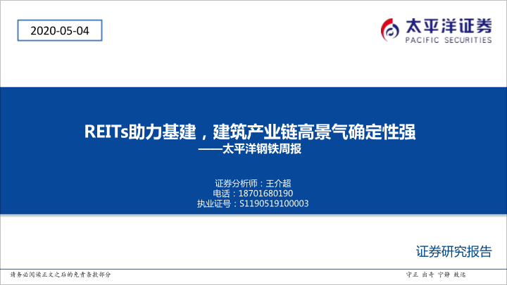 【太平洋证券】【20200504】20200504-太平洋-太平洋钢铁周报:REITs助力基建,建筑产业链高景气确定性强-44页