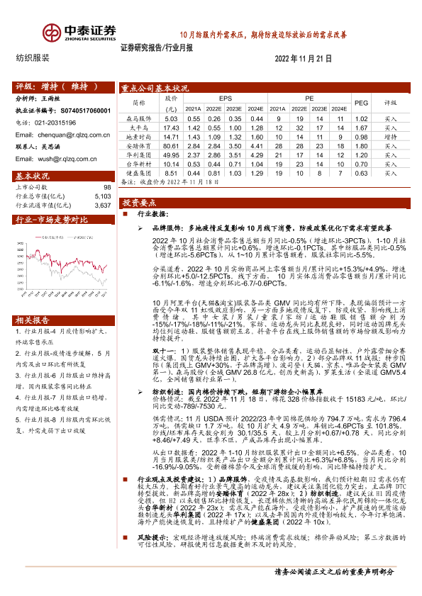 【中泰证券】【20221121】20221121-中泰证券-纺织服装行业月报:10月纺服内外需承压,期待防疫边际放松后的需求改善-20页