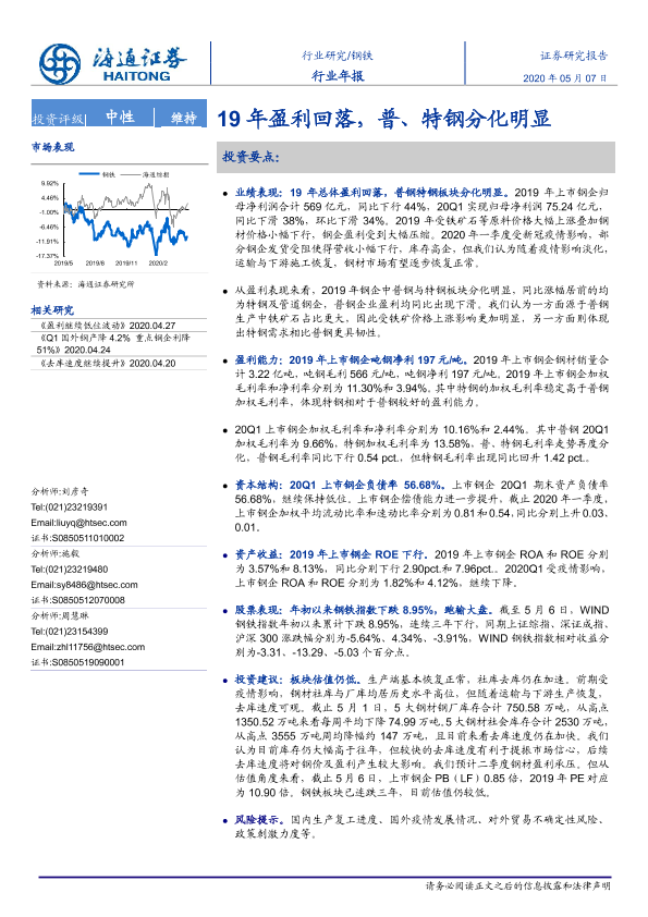【海通证券】【20200507】20200507-海通证券-钢铁行业年报:19年盈利回落,普、特钢分化明显-13页