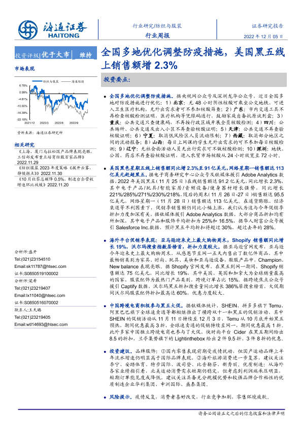 【海通证券】【20221205】20221205-海通证券-纺织与服装行业周报:全国多地优化调整防疫措施,美国黑五线上销售额增2.3%-11页