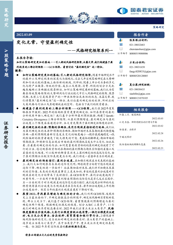 【国泰君安证券】【20220309】变化无常,守望盈利确定性——风格研究框架系列一-45页