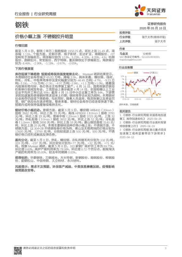 【天风证券】【20200510】20200510-天风证券-钢铁行业研究周报:价格小幅上涨 不锈钢拉升明显-14页