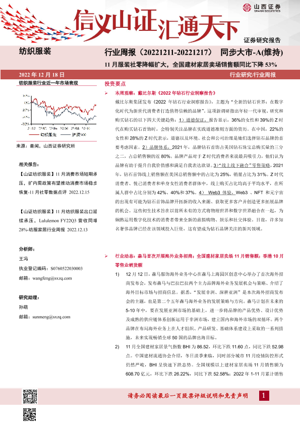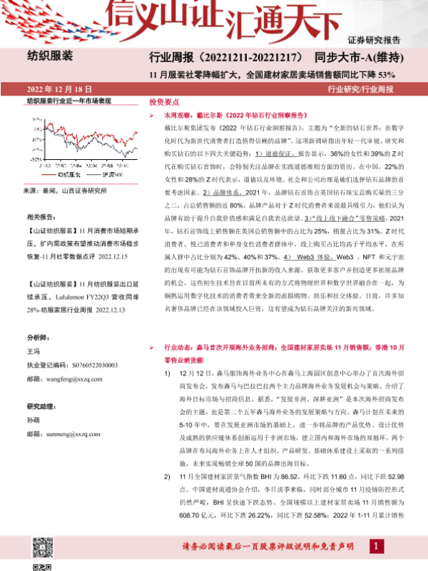 【山西证券】【20221218】20221218-山西证券-纺织服装行业周报:11月服装社零降幅扩大,全国建材家居卖场销售额同比下降53%-21页