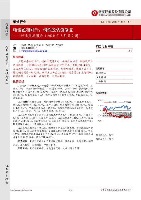 【浙商证券】【20200510】20200510-浙商证券-钢铁行业周度报告(2020年5月第2周):吨钢盈利回升,钢铁股估值修复-15页
