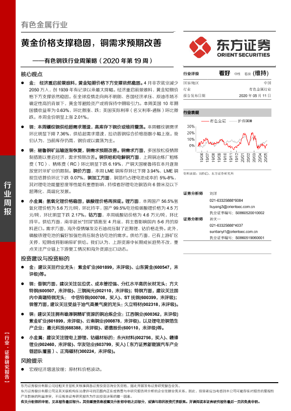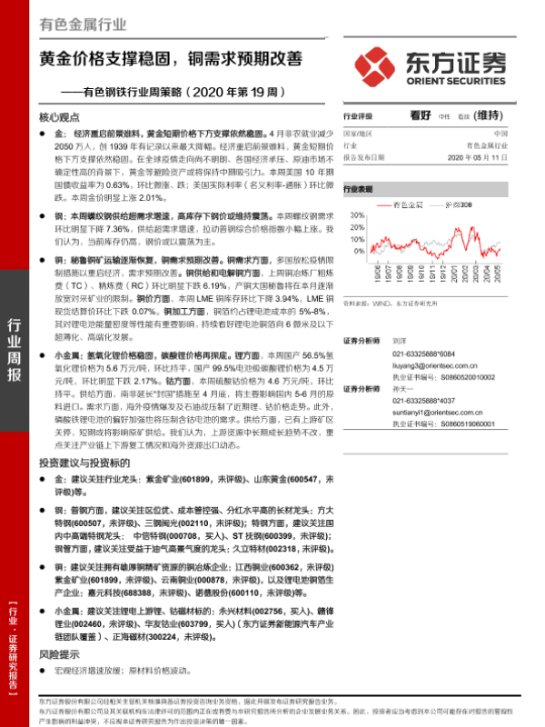 【东方证券】【20200511】20200511-东方证券-有色钢铁行业周策略(2020年第19周):黄金价格支撑稳固,铜需求预期改善-25页