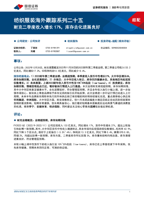 【国信证券】【20221222】纺织服装海外跟踪系列二十五:耐克二季度收入增长17%,库存去化进展良好-10页