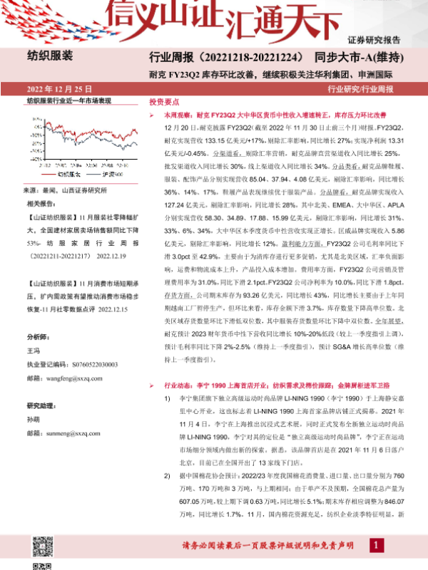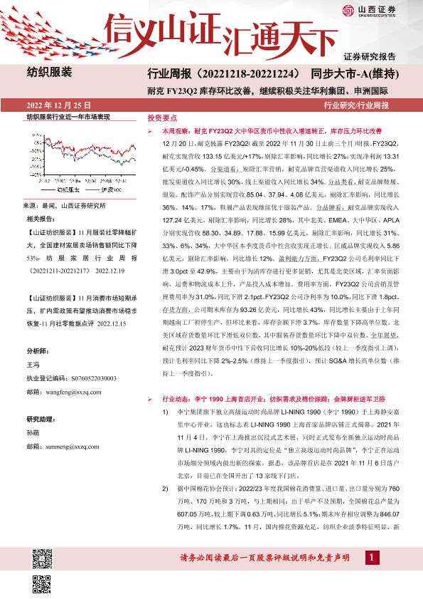 【山西证券】【20221225】纺织服装行业周报:耐克FY23Q2库存环比改善,继续积极关注华利集团、申洲国际-22页