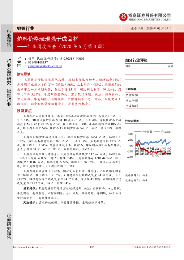 【浙商证券】【20200517】20200517-浙商证券-钢铁行业周度报告(2020年5月第3周):炉料价格表现强于成品材-15页