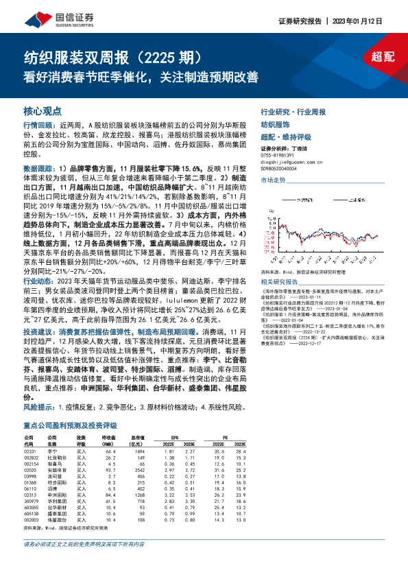 【国信证券】【20230112】20230112-国信证券-纺织服装双周报(2225期):看好消费春节旺季催化,关注制造预期改善-15页