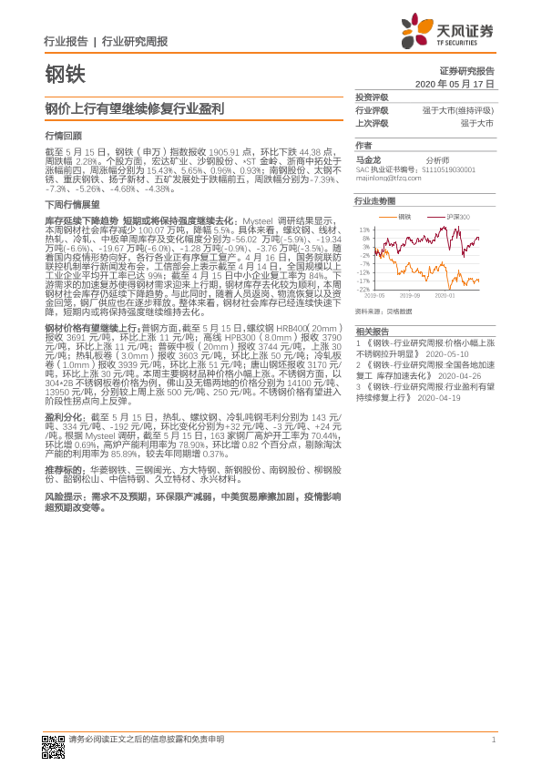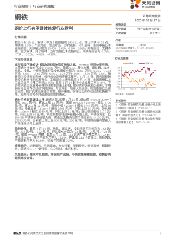 【天风证券】【20200517】20200517-天风证券-钢铁行业研究周报:钢价上行有望继续修复行业盈利-14页
