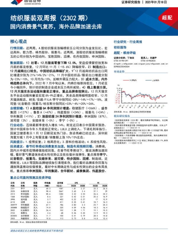 【国信证券】【20230118】20230118-国信证券-纺织服装双周报(2302期):国内消费景气复苏,海外品牌加速去库-15页