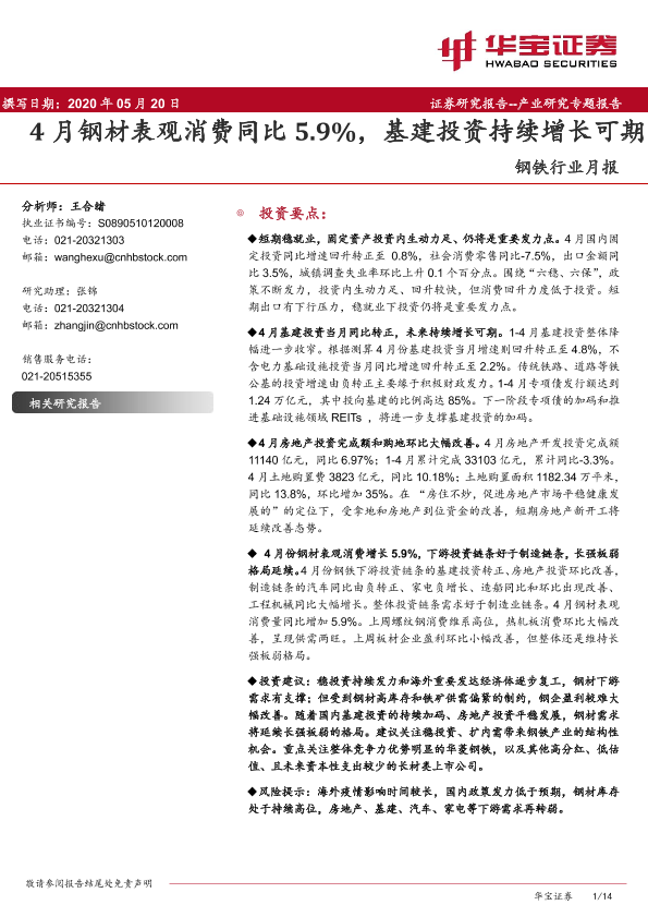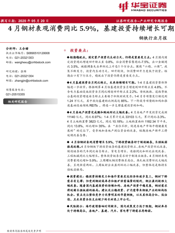 【华宝证券】【20200520】20200520-华宝证券-钢铁行业月报:4月钢材表观消费同比5.9%,基建投资持续增长可期-14页