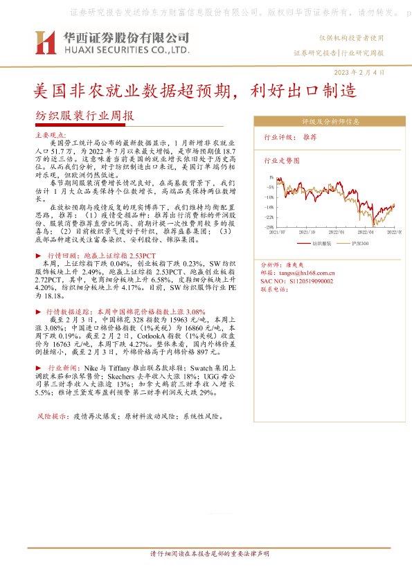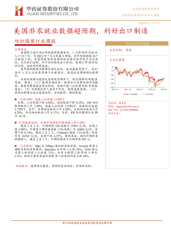 【华西证券】【20230204】20230204-华西证券-纺织服装行业周报:美国非农就业数据超预期,利好出口制造-15页