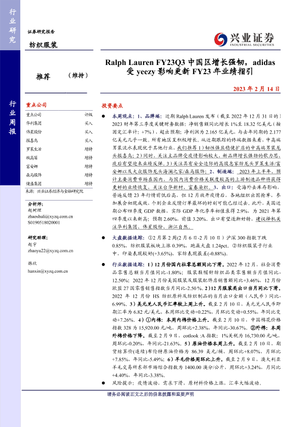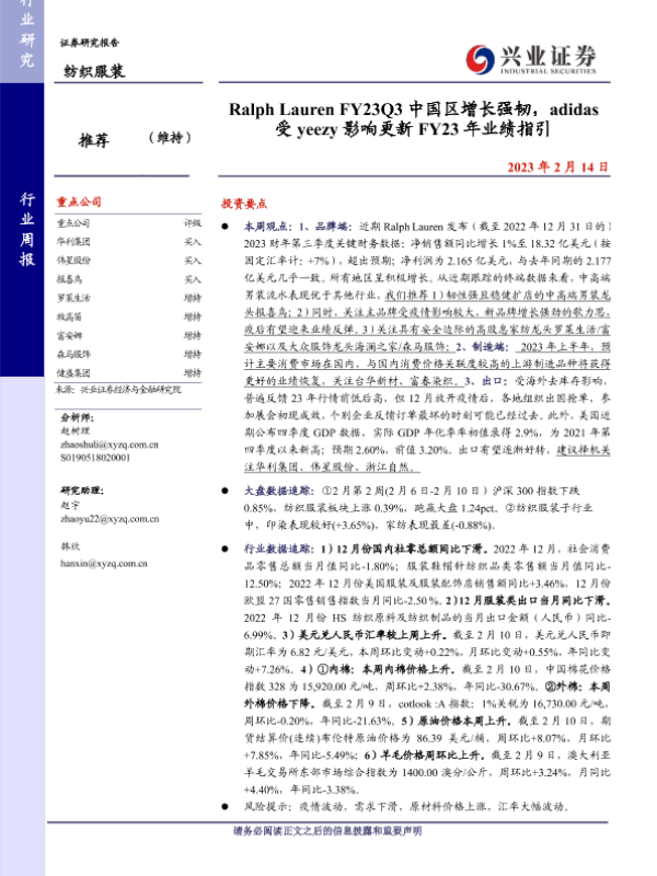 【兴业证券】【20230214】Ralph Lauren FY23Q3中国区增长强韧,adidas受 yeezy影响更新 FY23年业绩指引-18页