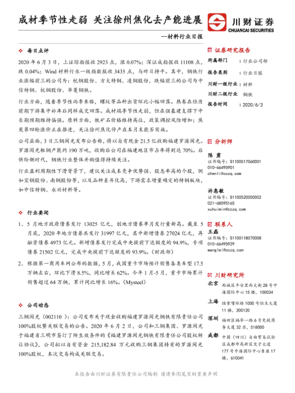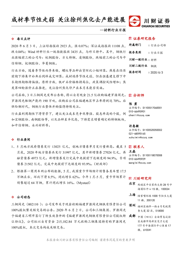 【川财证券】【20200603】成材季节性走弱 关注徐州焦化去产能进展-3页