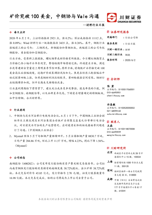 【川财证券】【20200602】材料行业日报:矿价突破100美金,中钢协与Vale沟通-3页
