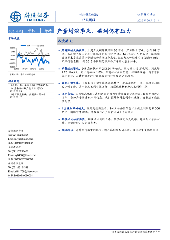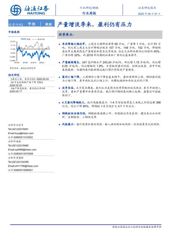 【海通证券】【20200601】20200601-海通证券-钢铁行业周报:产量增淡季来,盈利仍有压力-13页