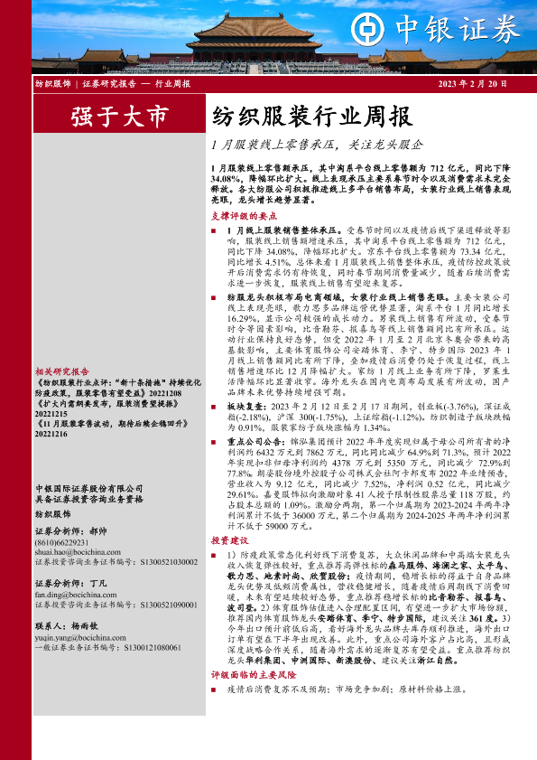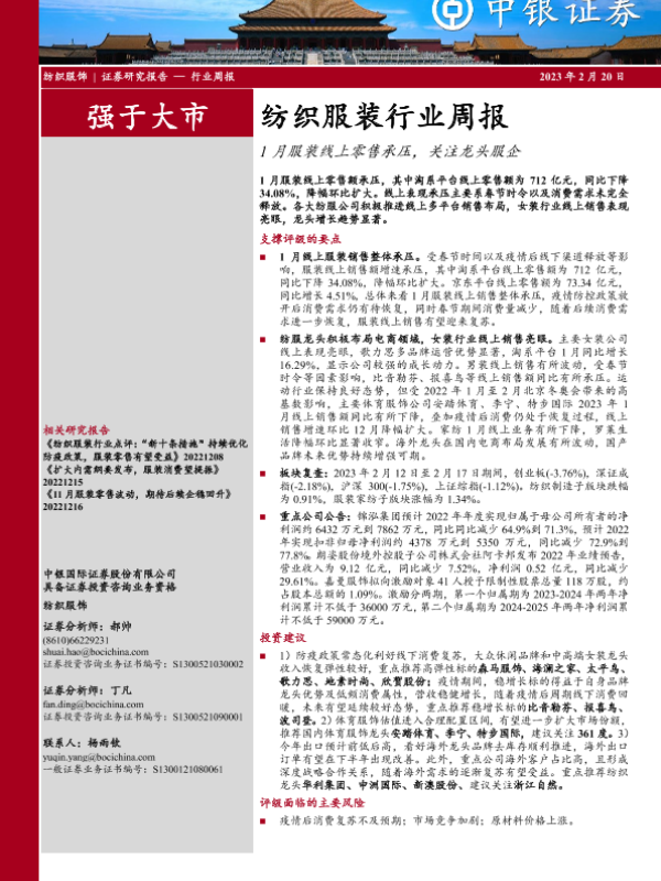 【中银证券】【20230220】20230220-中银证券-纺织服装行业周报:1月服装线上零售承压,关注龙头服企-24页