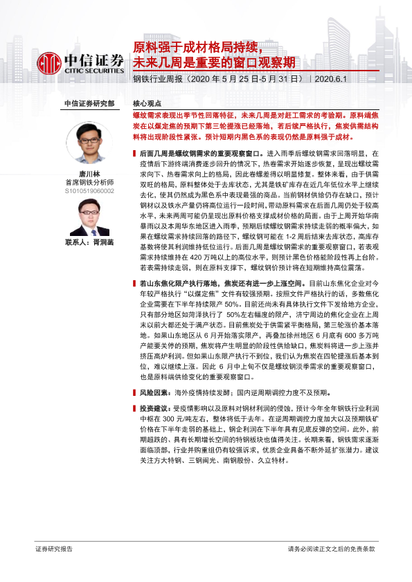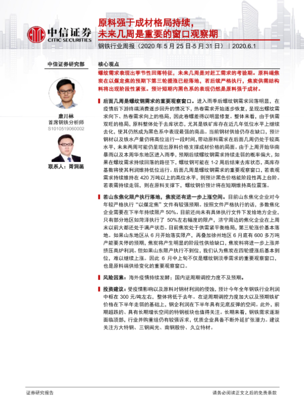 【中信证券】【20200601】20200601-中信证券-钢铁行业周报:原料强于成材格局持续,未来几周是重要的窗口观察期-13页